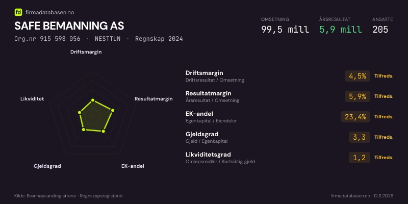 SAFE BEMANNING AS,NESTTUN — jo større areal, jo sterkere økonomi.Org.nr 915 598 056 · Regnskap2024