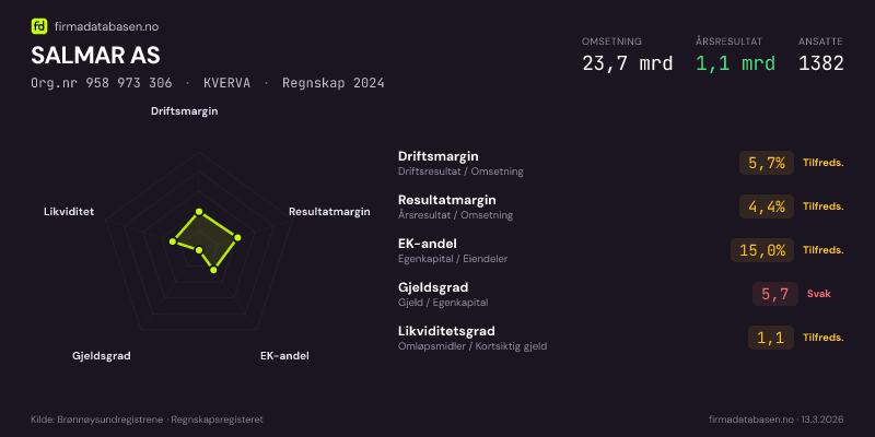 SALMAR AS hadde en omsetning på 23,7 MRDNOK for regnskapsåret 2024 ifølge siste innsendte årsregnskap. Regnskapstallene hentes fra Brønnøysundregistrene.