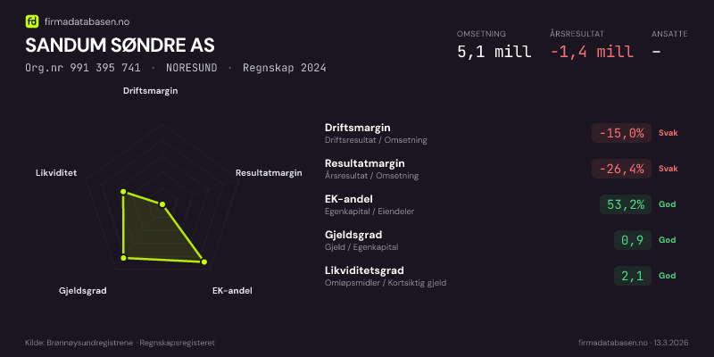 SANDUM SØNDRE AS hadde en omsetning på 5,1 MNOK for regnskapsåret 2024 ifølge siste innsendte årsregnskap. Regnskapstallene hentes fra Brønnøysundregistrene.