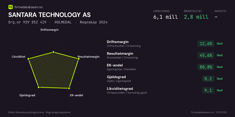 SANTARA TECHNOLOGY AS,HOLMEDAL — jo større areal, jo sterkere økonomi.Org.nr 929 852 419 · Regnskap2024