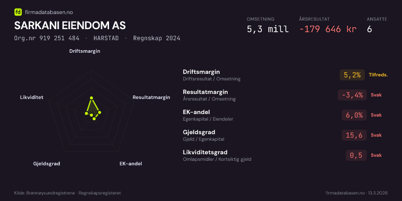 SARKANI EIENDOM AS hadde en omsetning på 5,3 MNOK for regnskapsåret 2024 ifølge siste innsendte årsregnskap. Regnskapstallene hentes fra Brønnøysundregistrene.