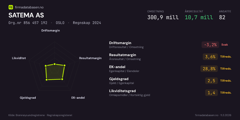 SATEMA AS hadde en omsetning på 300.9 mill i 2024, med driftsmargin på -3.2%.