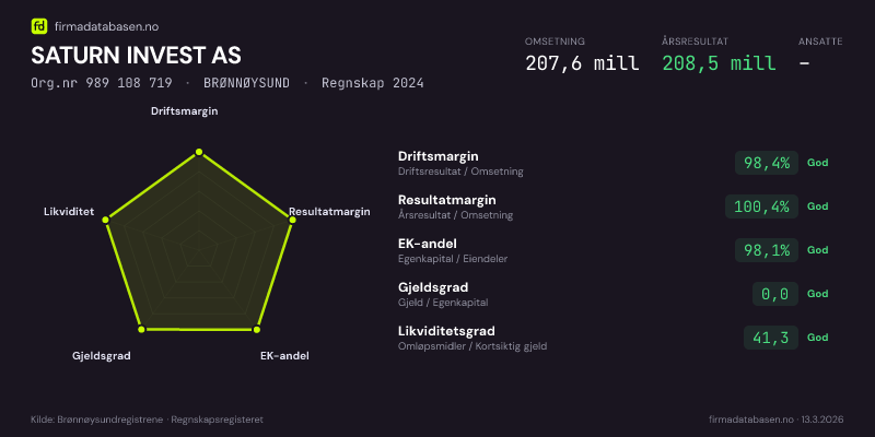 SATURN INVEST AS hadde en omsetning på 207,6 MNOK for regnskapsåret 2024 ifølge siste innsendte årsregnskap. Regnskapstallene hentes fra Brønnøysundregistrene.