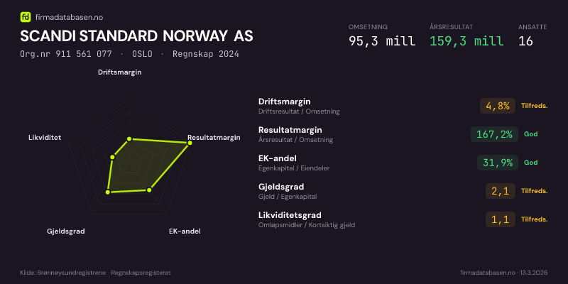 Firmadatabasen.no oppdateres nattlig med nye data fra Brønnøysundregistrene. Endringer i roller, adresse, status og andre registerdata fanges opp automatisk. Du kan følge SCANDI STANDARD NORWAY AS og få varsel på e-post når vi registrerer endringer — klikk «Følg selskap» øverst på denne siden.