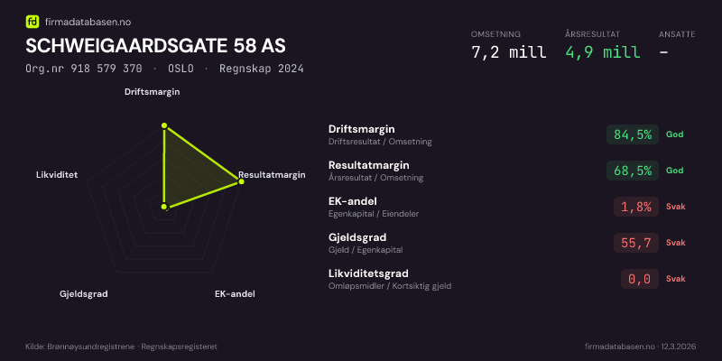 SCHWEIGAARDSGATE 58 AS hadde en omsetning på 7,2 MNOK for regnskapsåret 2024 ifølge siste innsendte årsregnskap. Regnskapstallene hentes fra Brønnøysundregistrene.