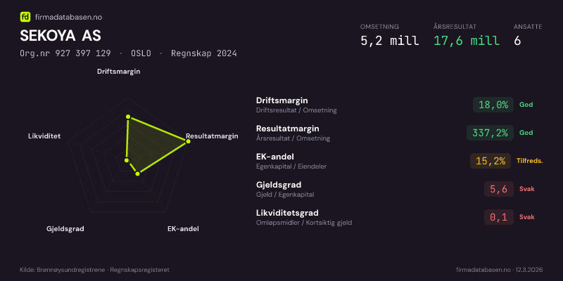 SEKOYA AS hadde en omsetning på 5,2 MNOK for regnskapsåret 2024 ifølge siste innsendte årsregnskap. Regnskapstallene hentes fra Brønnøysundregistrene.