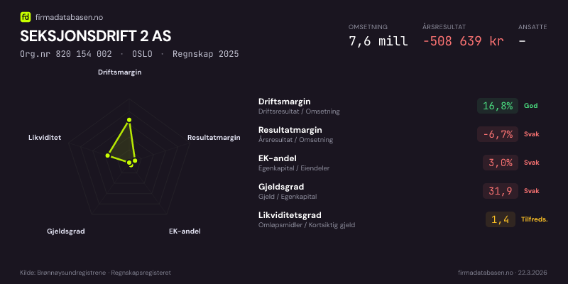 SEKSJONSDRIFT 2 AS hadde en omsetning på 7,6 MNOK for regnskapsåret 2025 ifølge siste innsendte årsregnskap. Regnskapstallene hentes fra Brønnøysundregistrene.