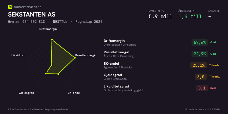 SEKSTANTEN AS hadde en omsetning på 5,9 MNOK for regnskapsåret 2024 ifølge siste innsendte årsregnskap. Regnskapstallene hentes fra Brønnøysundregistrene.