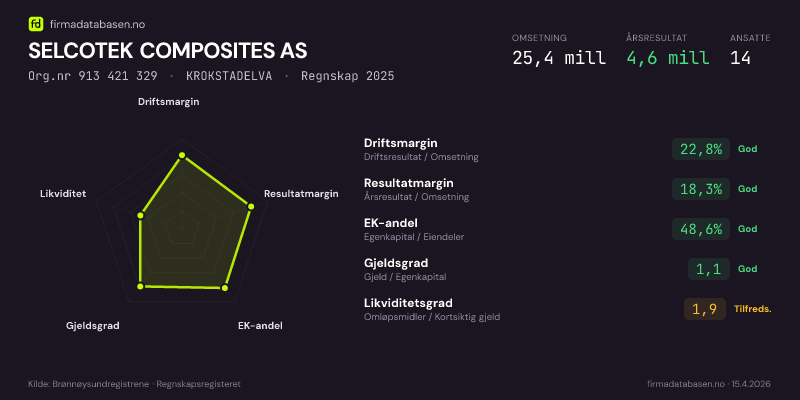 SELCOTEK COMPOSITES AS,KROKSTADELVA — jo større areal, jo sterkere økonomi.Org.nr 913 421 329 · Regnskap2025