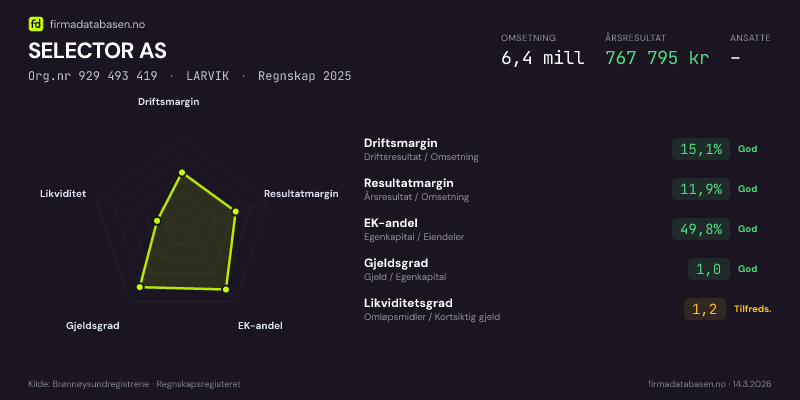 SELECTOR AS hadde en omsetning på 6,4 MNOK for regnskapsåret 2025 ifølge siste innsendte årsregnskap. Regnskapstallene hentes fra Brønnøysundregistrene.