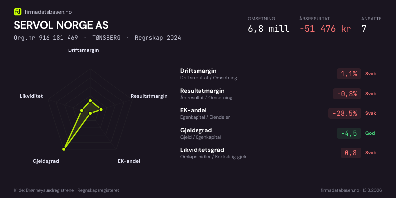 SERVOL NORGE AS hadde en omsetning på 6,8 MNOK for regnskapsåret 2024 ifølge siste innsendte årsregnskap. Regnskapstallene hentes fra Brønnøysundregistrene.