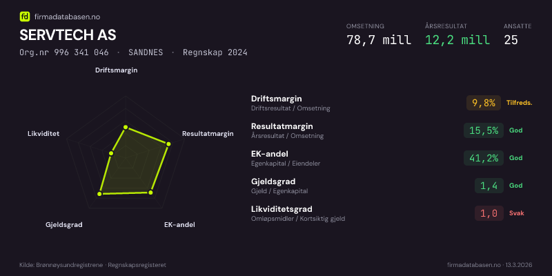 SERVTECH AS hadde en omsetning på 78.7 mill i 2024, med driftsmargin på 9.8%.
