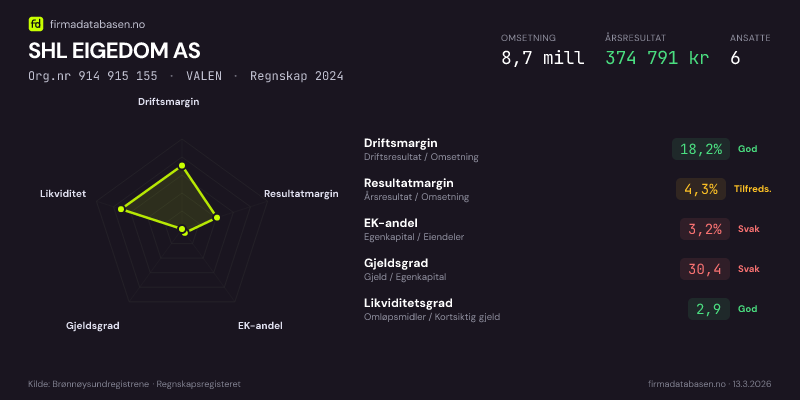 SHL EIGEDOM AS,VALEN — jo større areal, jo sterkere økonomi.Org.nr 914 915 155 · Regnskap2024