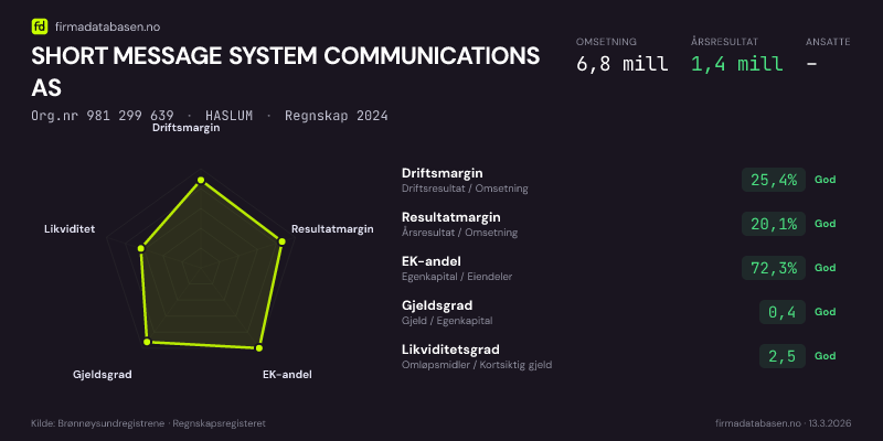 SHORT MESSAGE SYSTEM COMMUNICATIONS AS hadde en omsetning på 6,8 MNOK for regnskapsåret 2024 ifølge siste innsendte årsregnskap. Regnskapstallene hentes fra Brønnøysundregistrene.