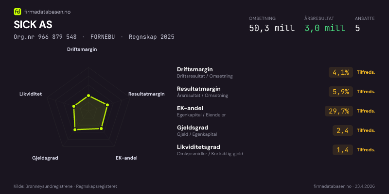 SICK AS hadde en omsetning på 129,9 MNOK for regnskapsåret 2024 ifølge siste innsendte årsregnskap. Regnskapstallene hentes fra Brønnøysundregistrene.