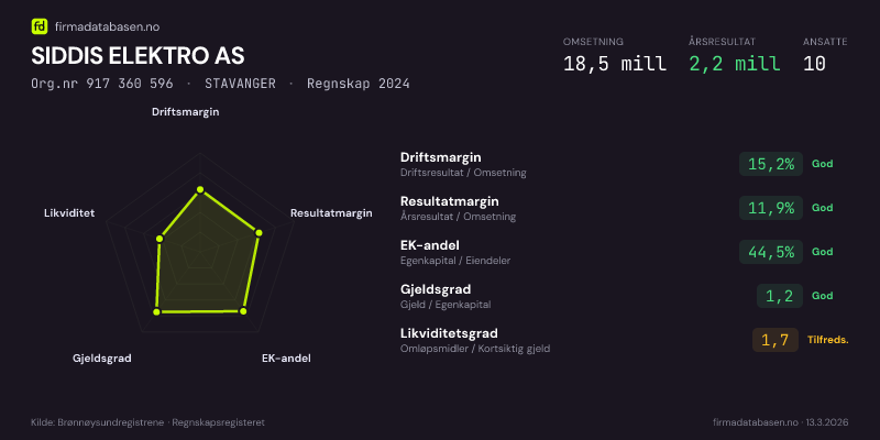 SIDDIS ELEKTRO AS hadde en omsetning på 18.5 mill i 2024, med driftsmargin på 15.2%.