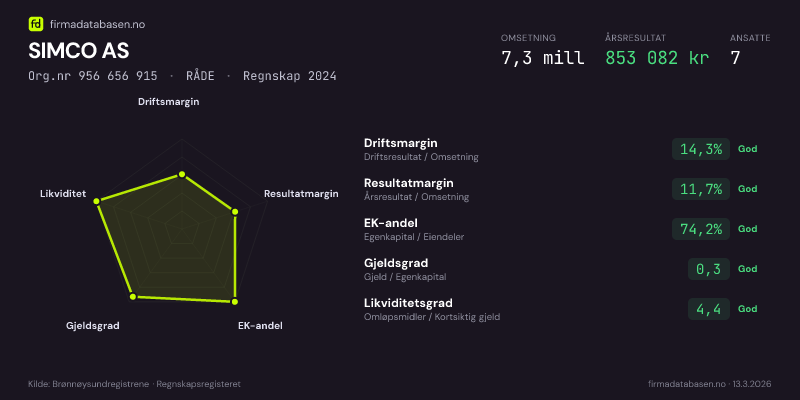 Firmadatabasen.no oppdateres nattlig med nye data fra Brønnøysundregistrene. Endringer i roller, adresse, status og andre registerdata fanges opp automatisk. Du kan følge SIMCO AS og få varsel på e-post når vi registrerer endringer — klikk «Følg selskap» øverst på denne siden.