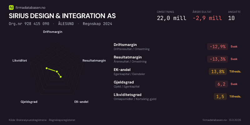 SIRIUS DESIGN & INTEGRATION AS hadde en omsetning på 22.0 mill i 2024, med driftsmargin på -12.9%.