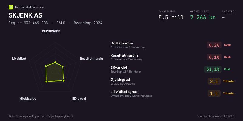 SKJENK AS hadde en omsetning på 5,5 MNOK for regnskapsåret 2024 ifølge siste innsendte årsregnskap. Regnskapstallene hentes fra Brønnøysundregistrene.