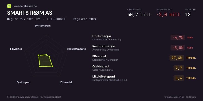 SMARTSTRØM AS hadde en omsetning på 40,7 MNOK for regnskapsåret 2024 ifølge siste innsendte årsregnskap. Regnskapstallene hentes fra Brønnøysundregistrene.