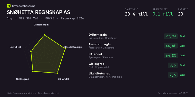 SNØHETTA REGNSKAP AS hadde en omsetning på 20,4 MNOK for regnskapsåret 2024 ifølge siste innsendte årsregnskap. Regnskapstallene hentes fra Brønnøysundregistrene.