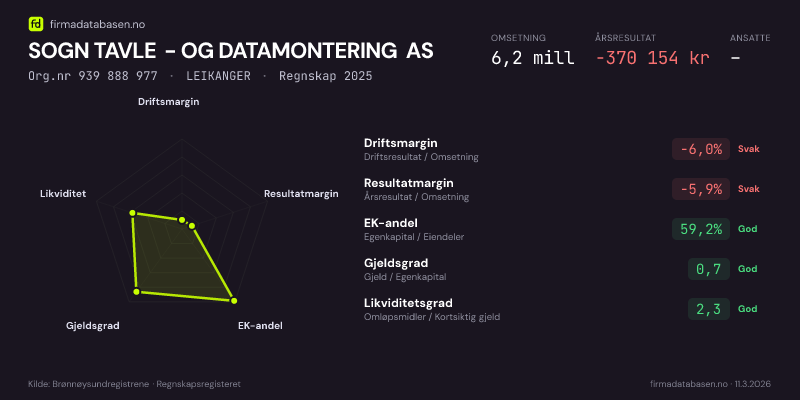 SOGN TAVLE - OG DATAMONTERING AS hadde en omsetning på 6,2 MNOK for regnskapsåret 2025 ifølge siste innsendte årsregnskap. Regnskapstallene hentes fra Brønnøysundregistrene.