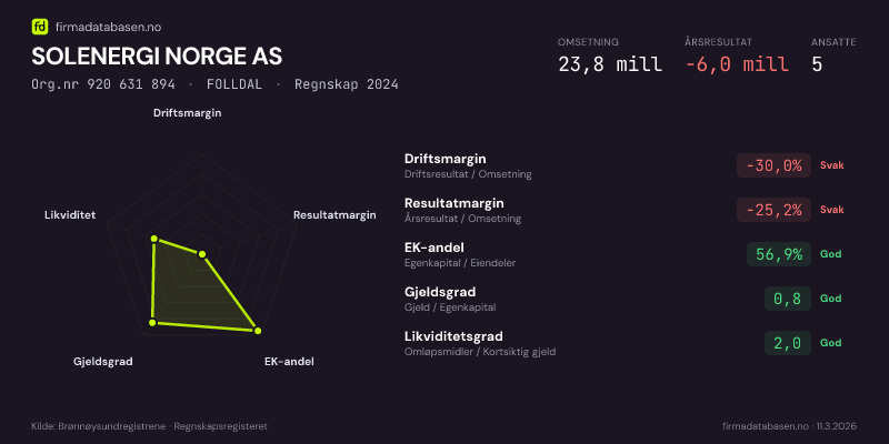SOLENERGI NORGE AS hadde en omsetning på 23.8 mill i 2024, med driftsmargin på -30.0%.