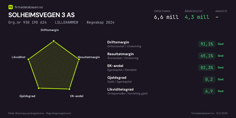 SOLHEIMSVEGEN 3 AS er et aksjeselskap, innen utleie av egen eller leid fast eiendom, stiftet i 2022 i Lillehammer. I 2024 hadde selskapet en omsetning på 6.6 mill og en driftsmargin på 91.1 %.