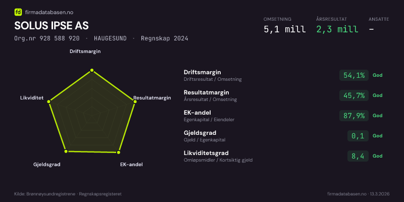 SOLUS IPSE AS hadde en omsetning på 5.1 mill i 2024, med driftsmargin på 54.1%.