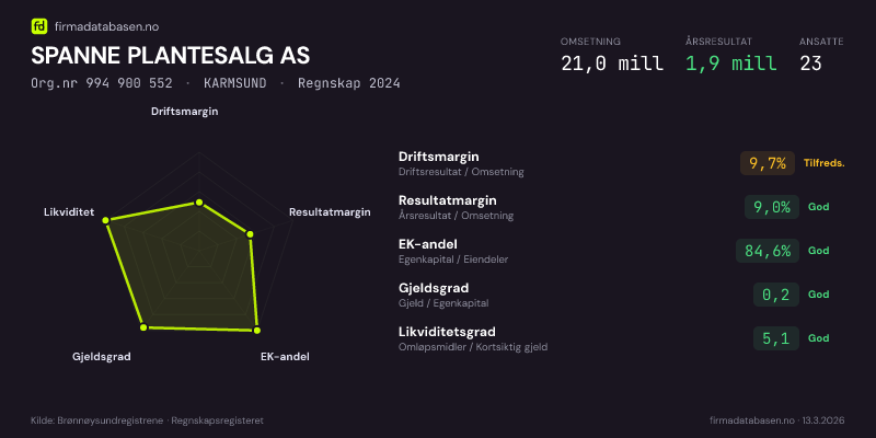 SPANNE PLANTESALG AS,KARMSUND — jo større areal, jo sterkere økonomi.Org.nr 994 900 552 · Regnskap2024