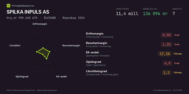 SPILKA INPULS AS hadde en omsetning på 11,4 MNOK for regnskapsåret 2024 ifølge siste innsendte årsregnskap. Regnskapstallene hentes fra Brønnøysundregistrene.