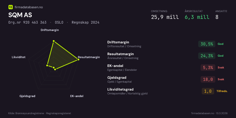 SQM AS hadde en omsetning på 25,9 MNOK for regnskapsåret 2024 ifølge siste innsendte årsregnskap. Regnskapstallene hentes fra Brønnøysundregistrene.