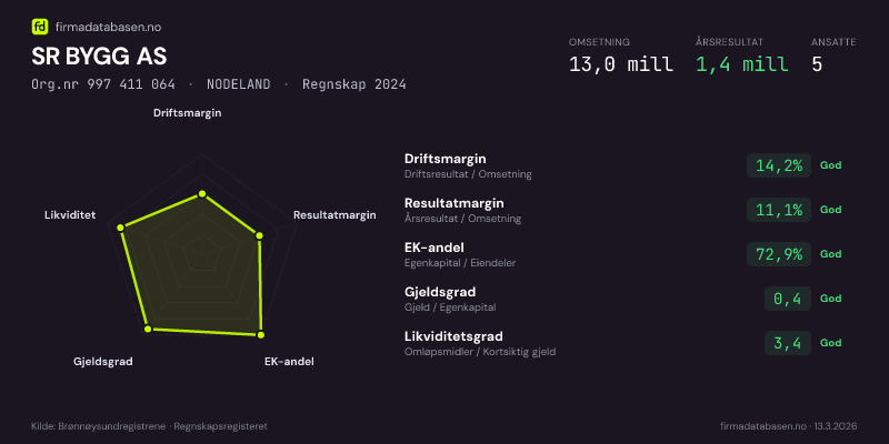 SR BYGG AS hadde en omsetning på 13.0 mill i 2024, med driftsmargin på 14.2%.