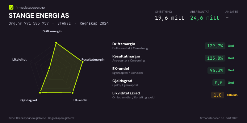 STANGE ENERGI AS hadde en omsetning på 19,6 MNOK for regnskapsåret 2024 ifølge siste innsendte årsregnskap. Regnskapstallene hentes fra Brønnøysundregistrene.