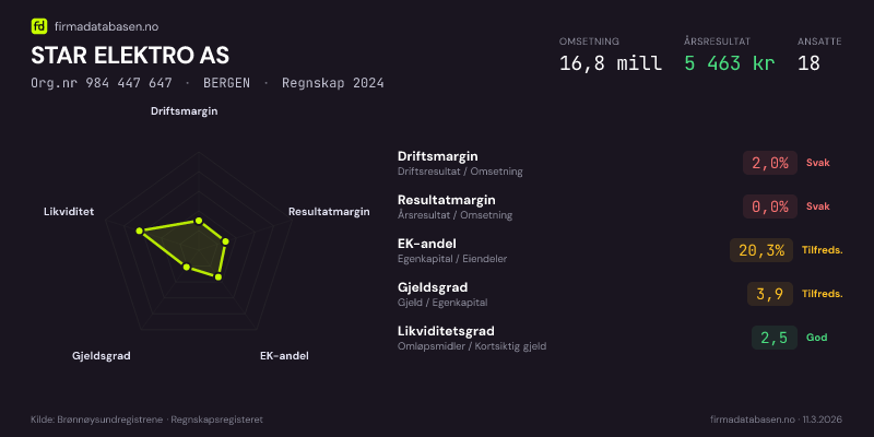 Firmadatabasen.no oppdateres nattlig med nye data fra Brønnøysundregistrene. Endringer i roller, adresse, status og andre registerdata fanges opp automatisk. Du kan følge STAR ELEKTRO AS og få varsel på e-post når vi registrerer endringer — klikk «Følg selskap» øverst på denne siden.