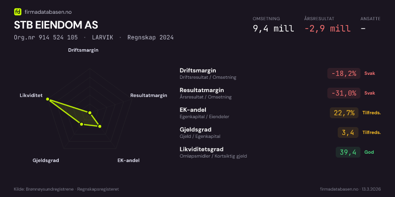 STB EIENDOM AS,LARVIK — jo større areal, jo sterkere økonomi.Org.nr 914 524 105 · Regnskap2024