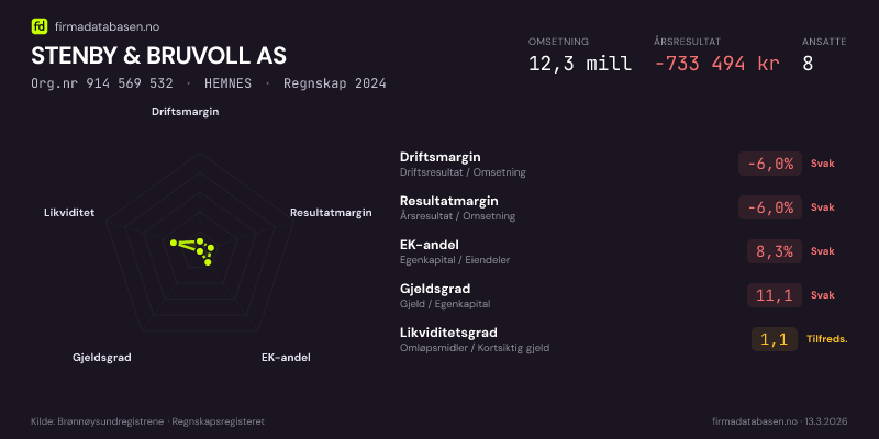 STENBY & BRUVOLL AS hadde en omsetning på 12,3 MNOK for regnskapsåret 2024 ifølge siste innsendte årsregnskap. Regnskapstallene hentes fra Brønnøysundregistrene.