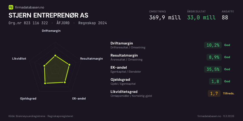 STJERN ENTREPRENØR AS hadde en omsetning på 369,9 MNOK for regnskapsåret 2024 ifølge siste innsendte årsregnskap. Regnskapstallene hentes fra Brønnøysundregistrene.