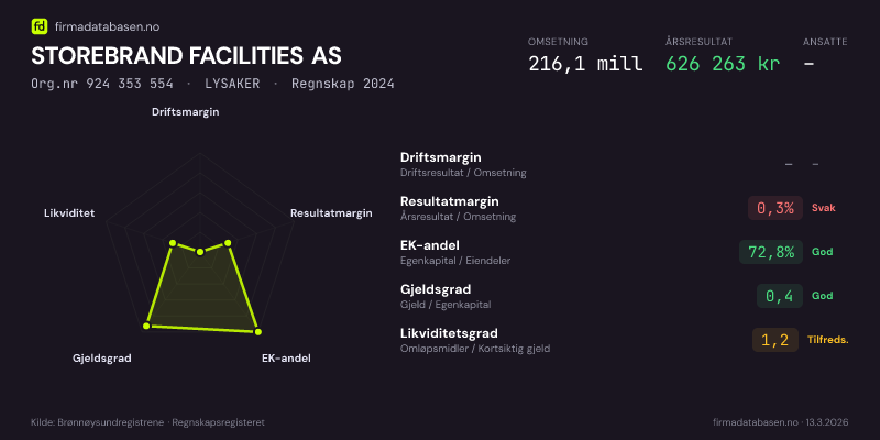 STOREBRAND FACILITIES AS hadde en omsetning på 216,1 MNOK for regnskapsåret 2024 ifølge siste innsendte årsregnskap. Regnskapstallene hentes fra Brønnøysundregistrene.