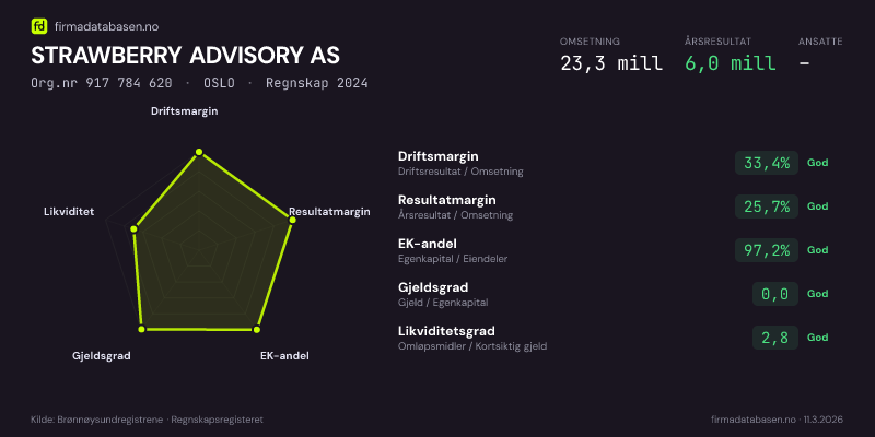 STRAWBERRY ADVISORY AS hadde en omsetning på 23,3 MNOK for regnskapsåret 2024 ifølge siste innsendte årsregnskap. Regnskapstallene hentes fra Brønnøysundregistrene.