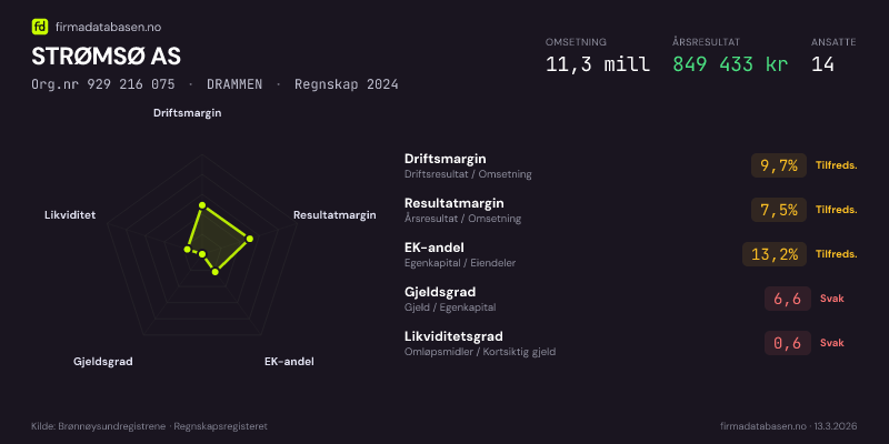 STRØMSØ AS hadde en omsetning på 11,3 MNOK for regnskapsåret 2024 ifølge siste innsendte årsregnskap. Regnskapstallene hentes fra Brønnøysundregistrene.
