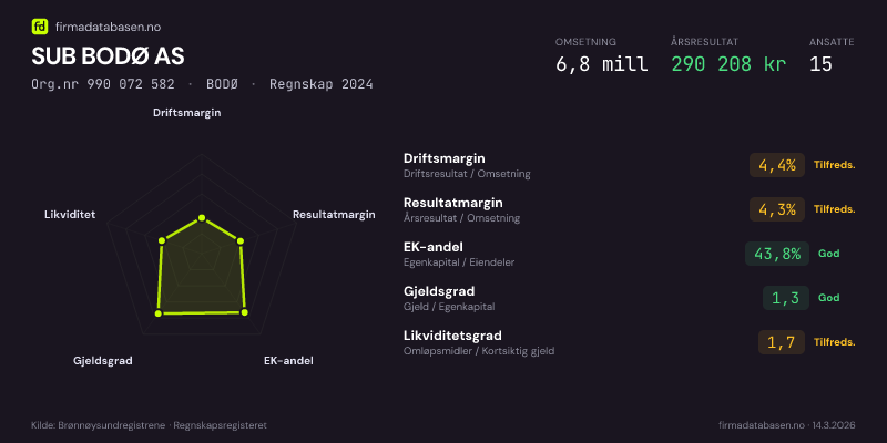 SUB BODØ AS hadde en omsetning på 6,8 MNOK for regnskapsåret 2024 ifølge siste innsendte årsregnskap. Regnskapstallene hentes fra Brønnøysundregistrene.