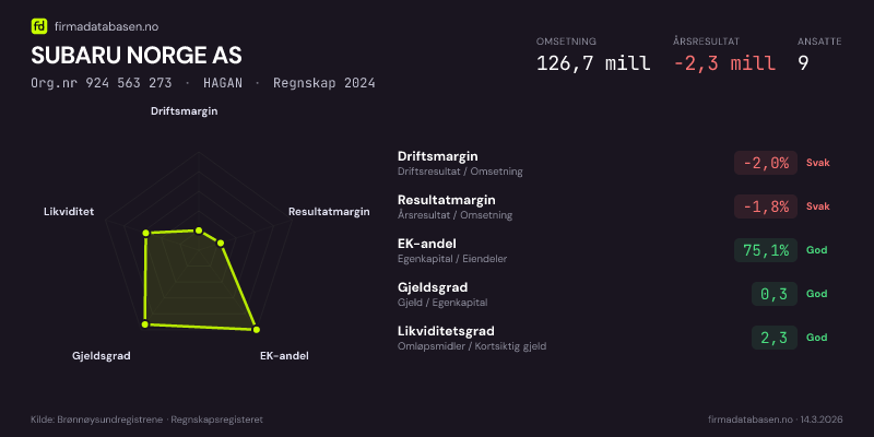 SUBARU NORGE AS,HAGAN — jo større areal, jo sterkere økonomi.Org.nr 924 563 273 · Regnskap2024