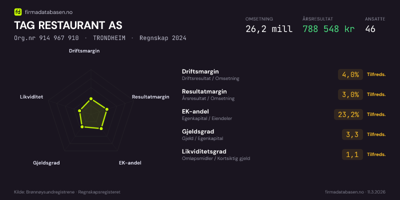 TAG RESTAURANT AS hadde en omsetning på 26.2 mill i 2024, med driftsmargin på 4.0%.