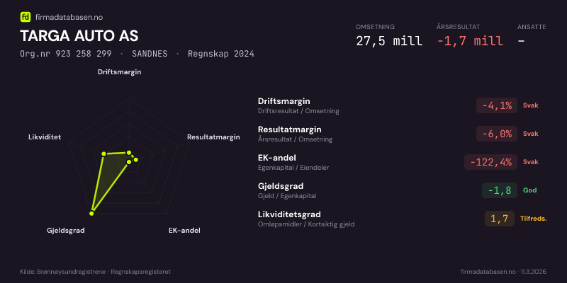 TARGA AUTO AS,SANDNES — jo større areal, jo sterkere økonomi.Org.nr 923 258 299 · Regnskap2024