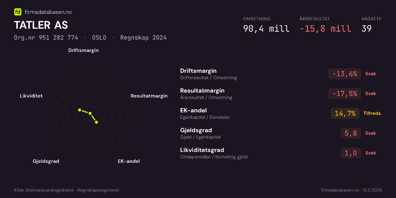 TATLER AS hadde en omsetning på 90,4 MNOK for regnskapsåret 2024 ifølge siste innsendte årsregnskap. Regnskapstallene hentes fra Brønnøysundregistrene.