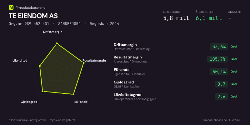 TE EIENDOM AS,SANDEFJORD — jo større areal, jo sterkere økonomi.Org.nr 989 452 401 · Regnskap2024