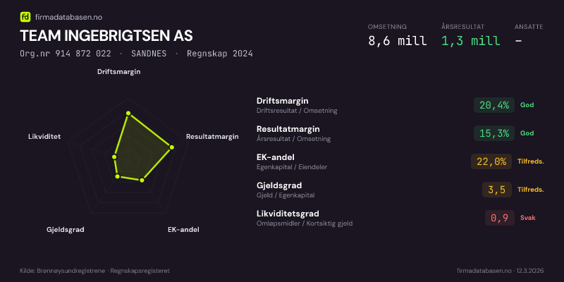Firmadatabasen.no oppdateres nattlig med nye data fra Brønnøysundregistrene. Endringer i roller, adresse, status og andre registerdata fanges opp automatisk. Du kan følge TEAM INGEBRIGTSEN AS og få varsel på e-post når vi registrerer endringer — klikk «Følg selskap» øverst på denne siden.