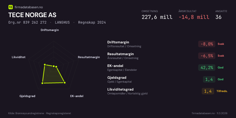 TECE NORGE AS hadde en omsetning på 227.6 mill i 2024, med driftsmargin på -8.0%.