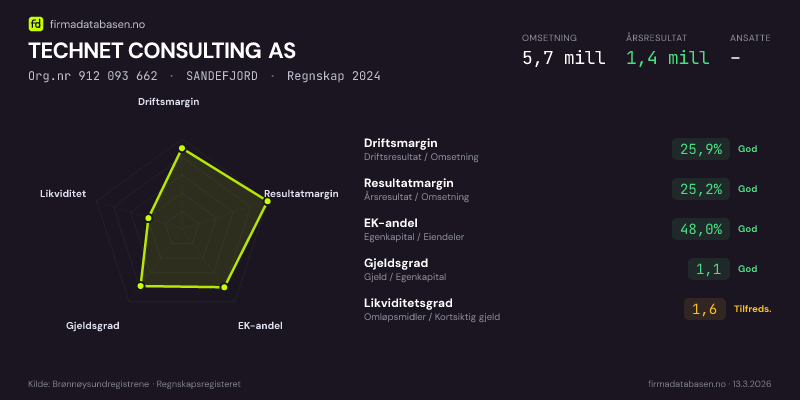 Firmadatabasen.no oppdateres nattlig med nye data fra Brønnøysundregistrene. Endringer i roller, adresse, status og andre registerdata fanges opp automatisk. Du kan følge TECHNET CONSULTING AS og få varsel på e-post når vi registrerer endringer — klikk «Følg selskap» øverst på denne siden.